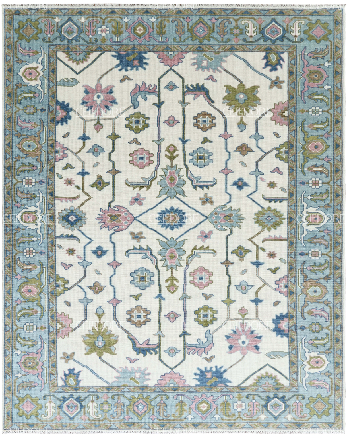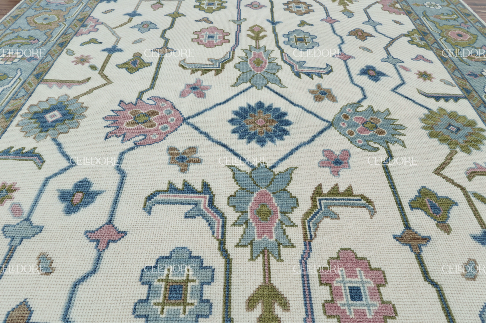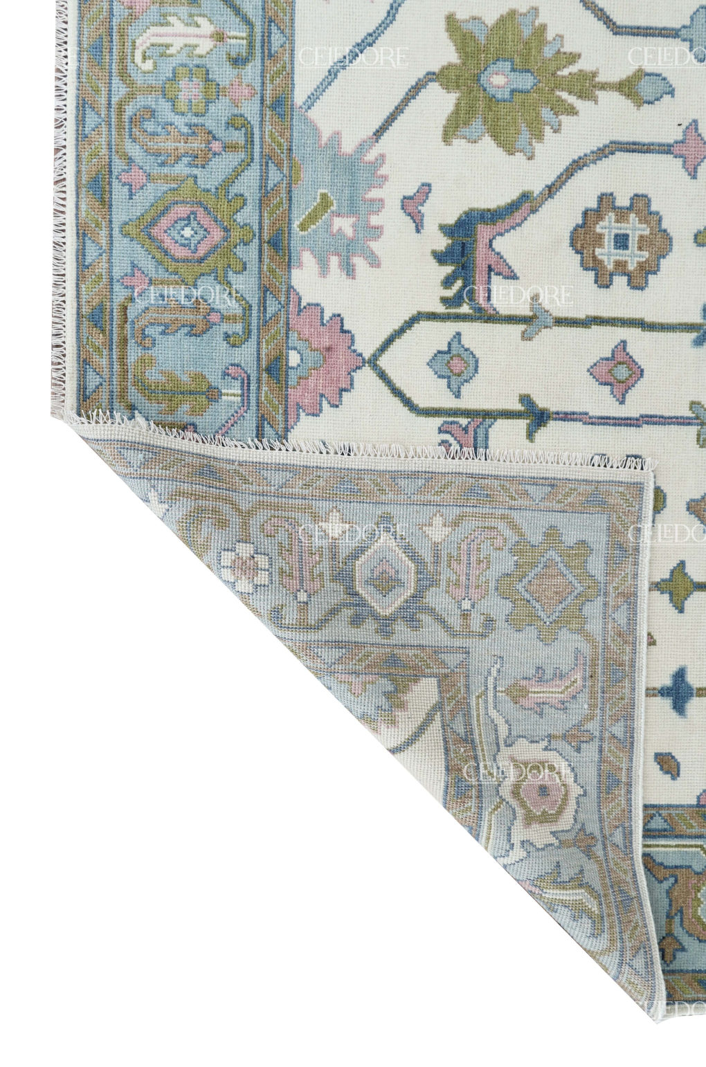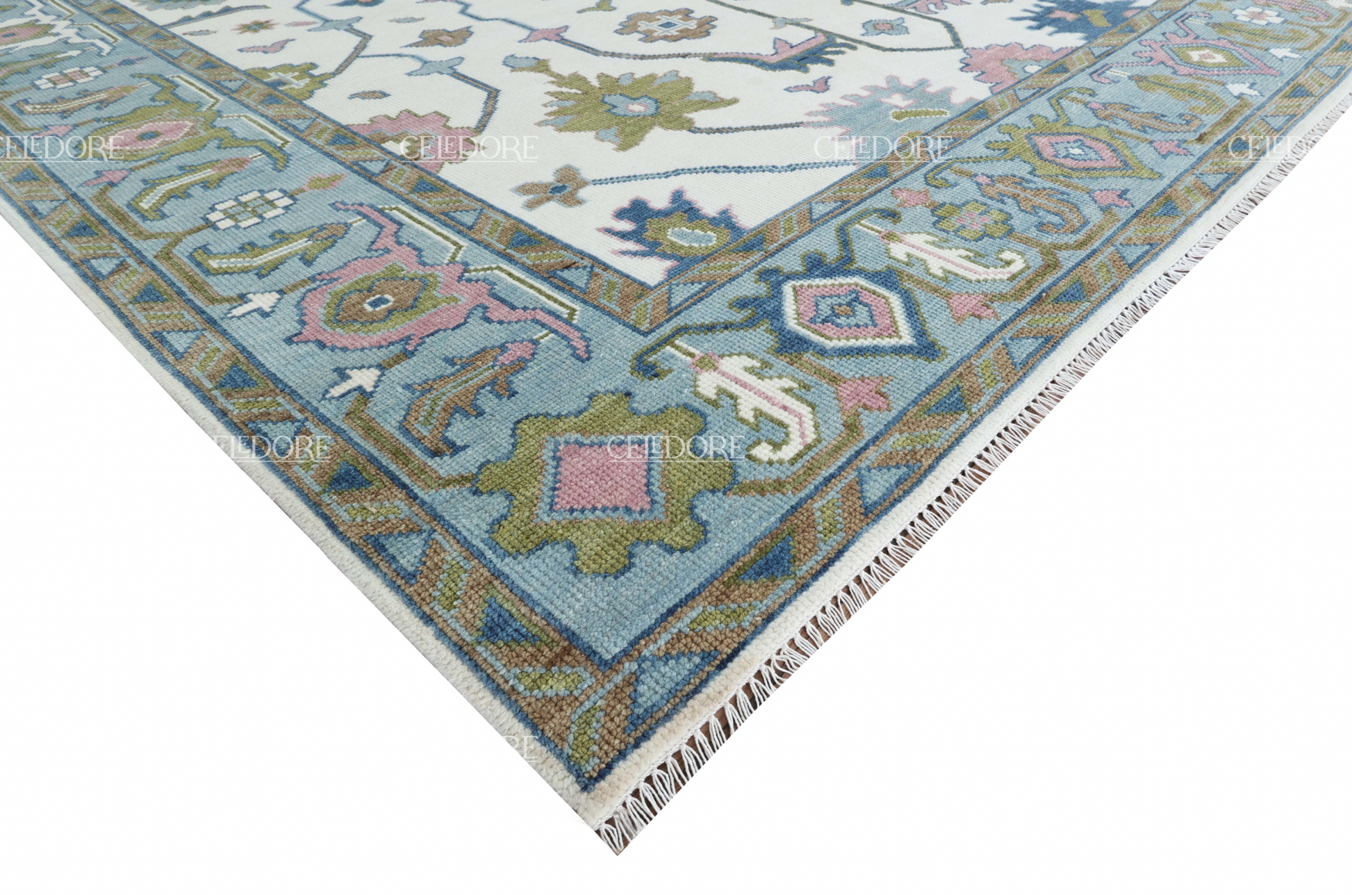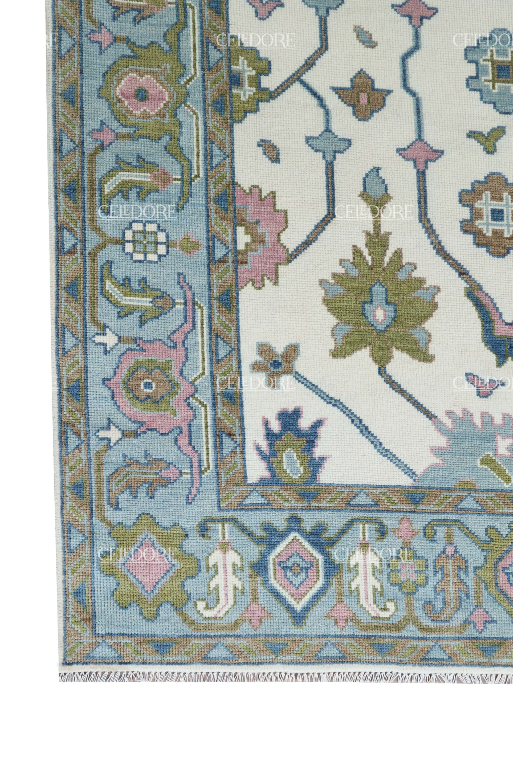 Hand-Knotted Oushak Rug, meticulously crafted with the finest quality wool. This rug embodies the rich tapestry of Indian craftsmanship, blending traditional design with a contemporary twist, reminiscent of the vibrant villages of India.