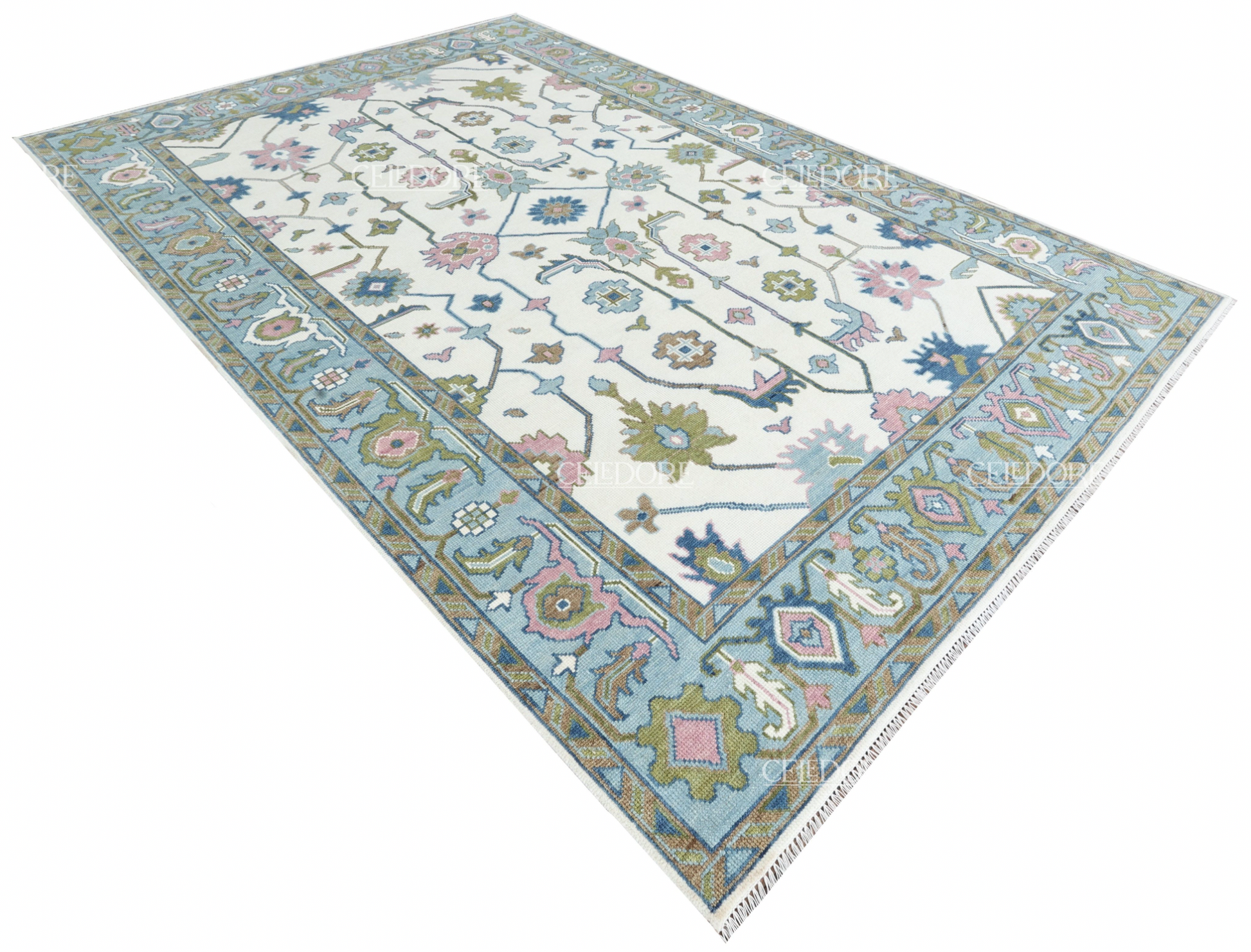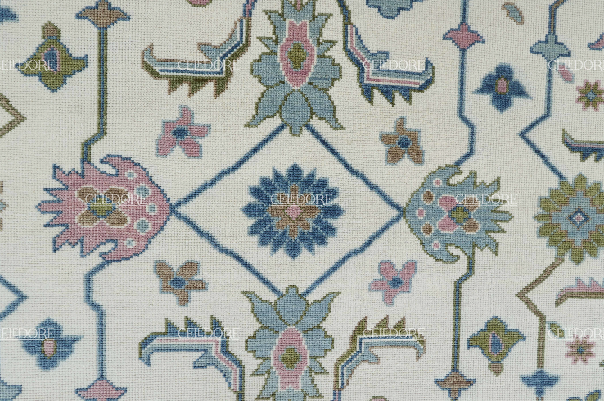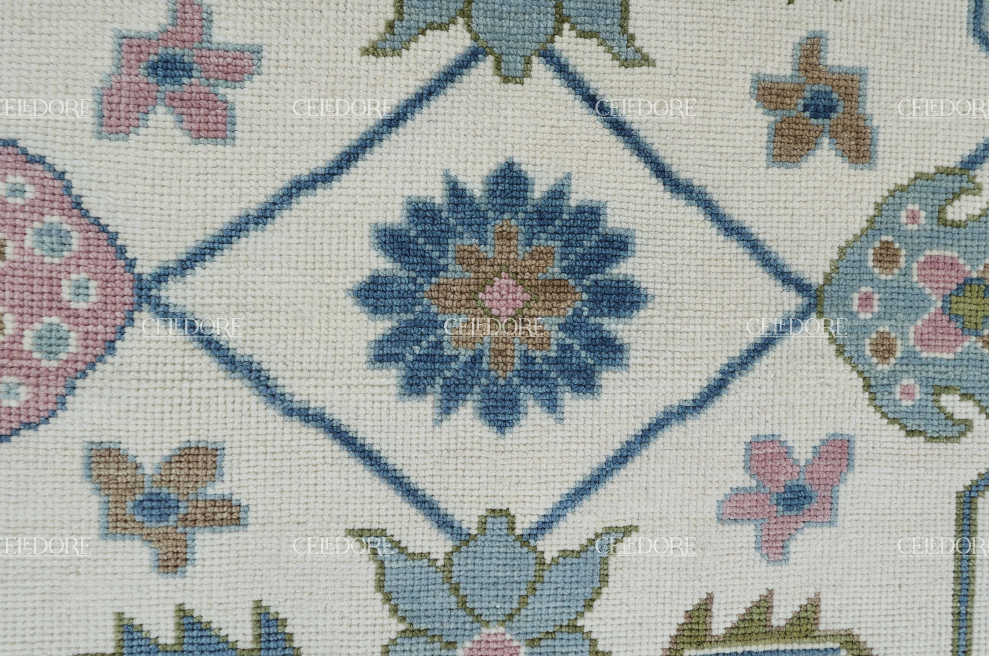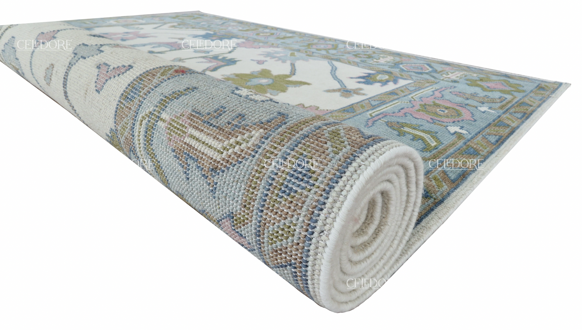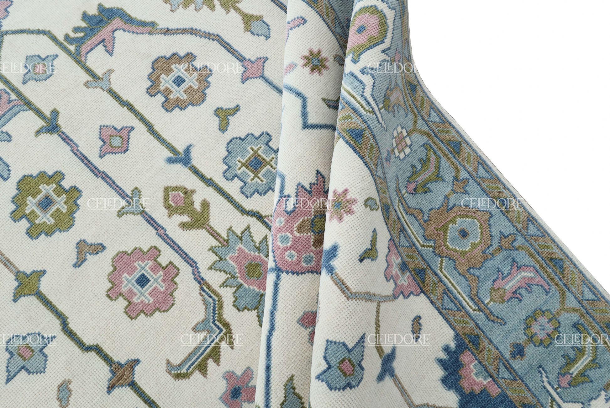 Hand-Knotted Oushak Rug, meticulously crafted with the finest quality wool. This rug embodies the rich tapestry of Indian craftsmanship, blending traditional design with a contemporary twist, reminiscent of the vibrant villages of India.