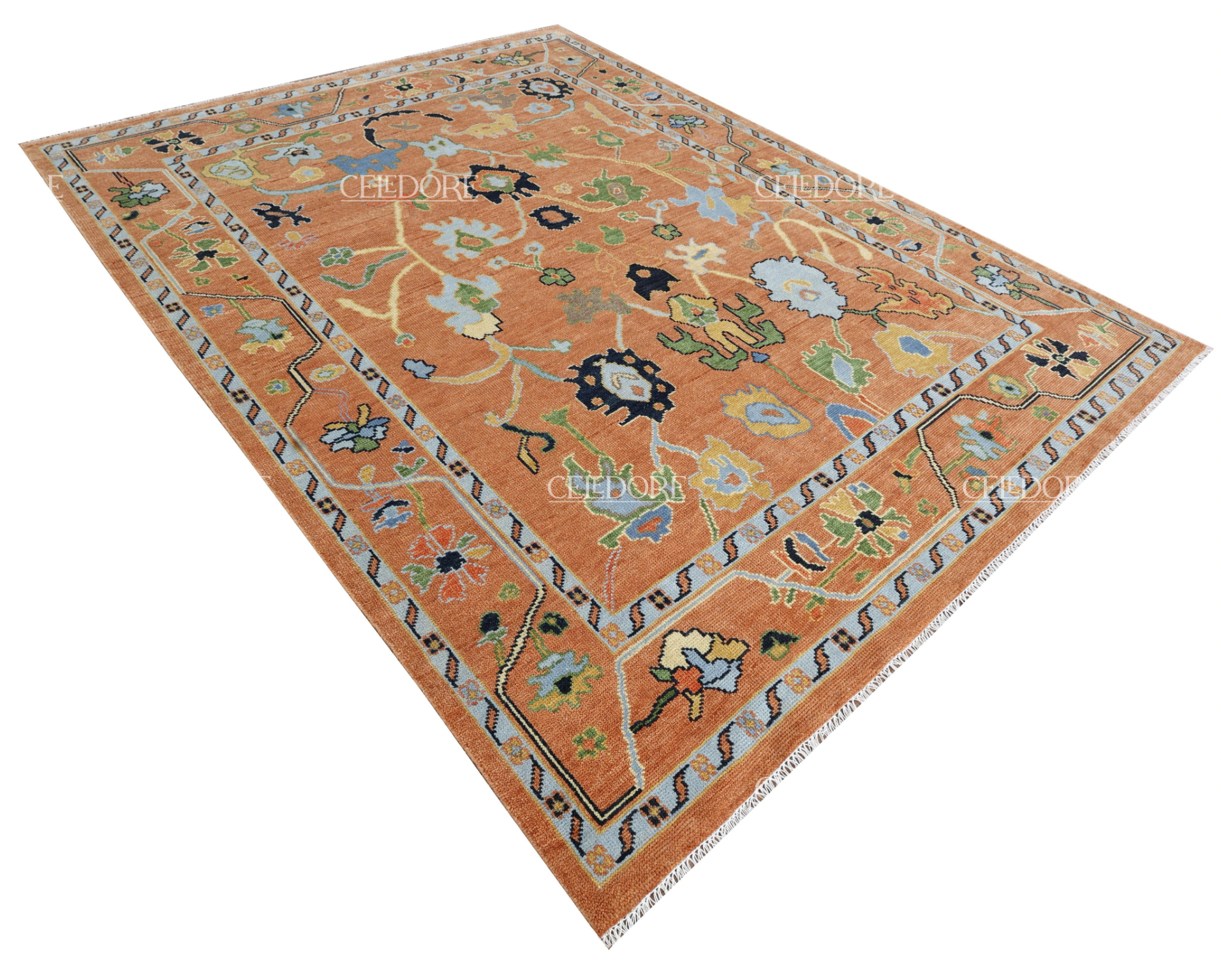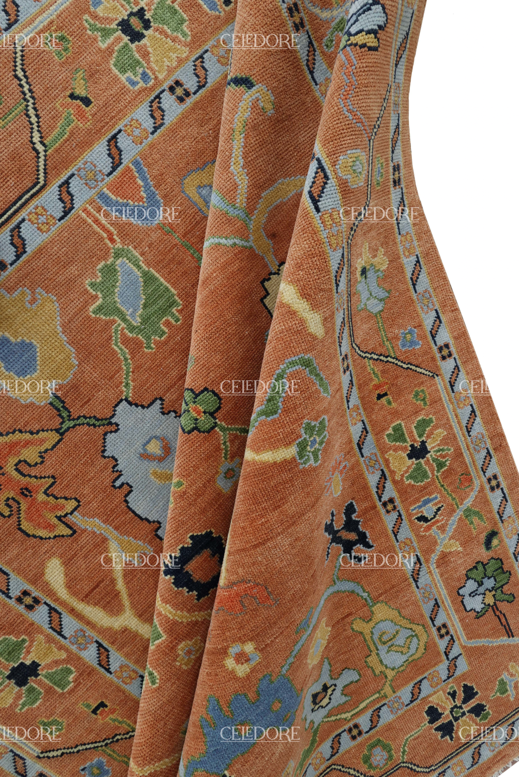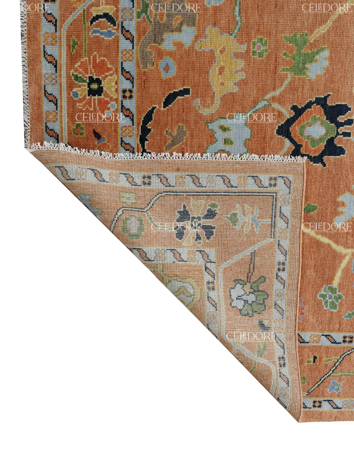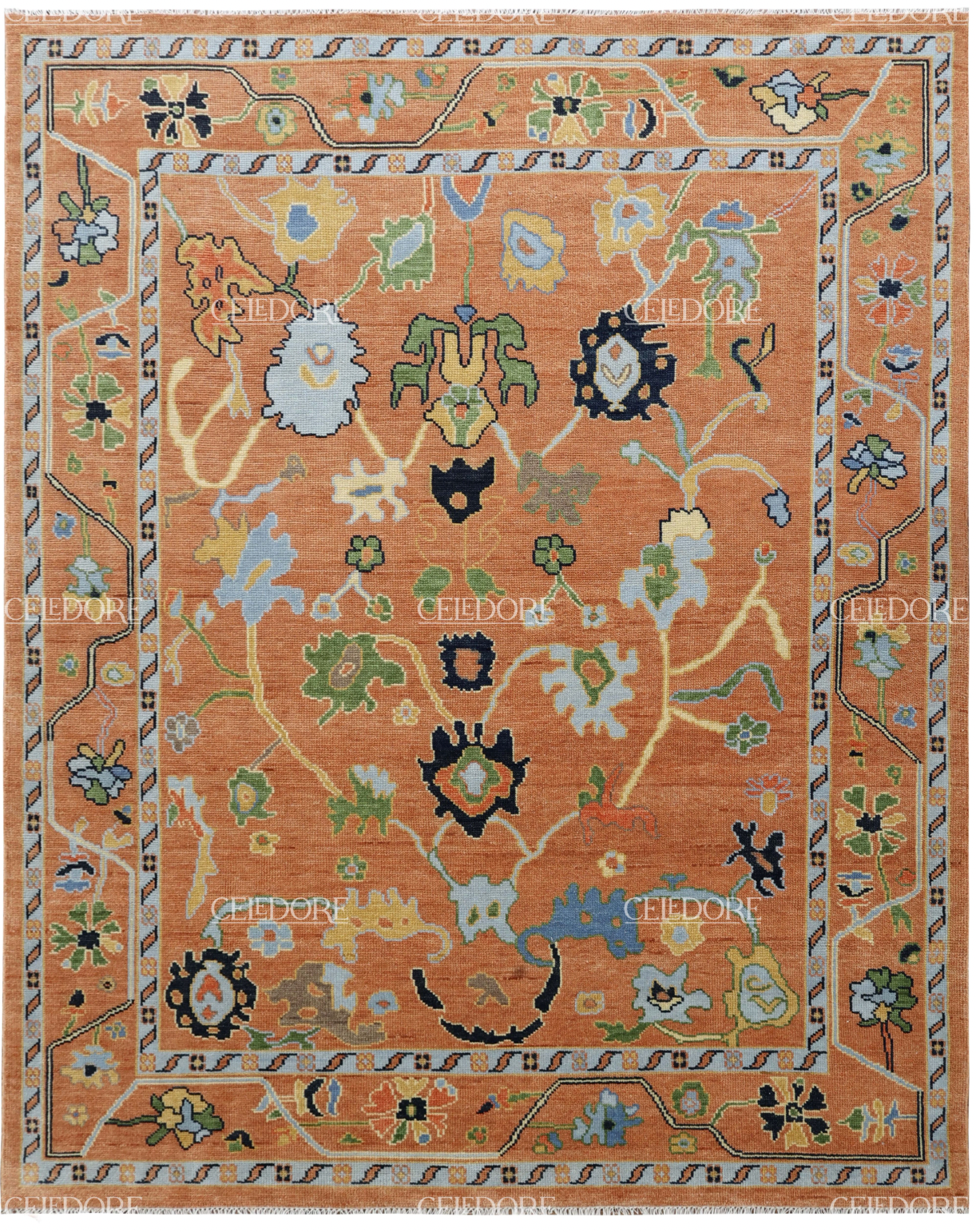 Hand-Knotted Oushak Rug, meticulously crafted with the finest quality wool. This rug embodies the rich tapestry of Indian craftsmanship, blending traditional design with a contemporary twist, reminiscent of the vibrant villages of India.
