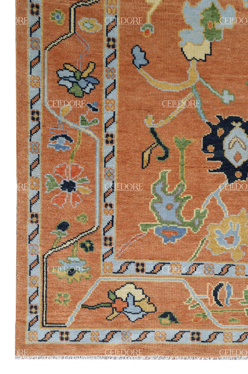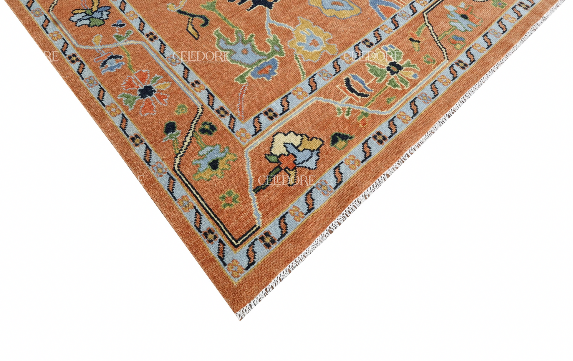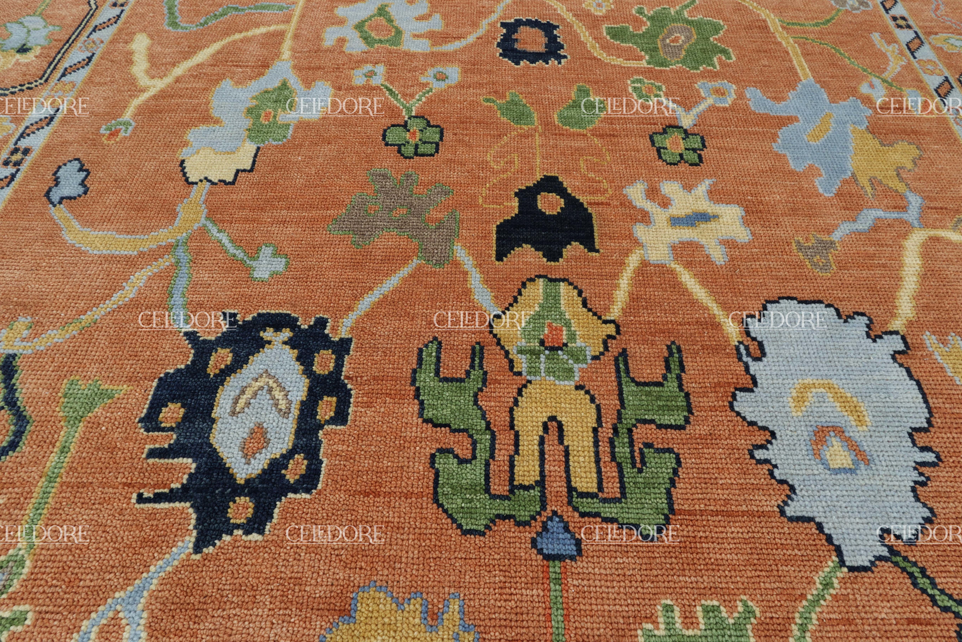 Hand-Knotted Oushak Rug, meticulously crafted with the finest quality wool. This rug embodies the rich tapestry of Indian craftsmanship, blending traditional design with a contemporary twist, reminiscent of the vibrant villages of India.