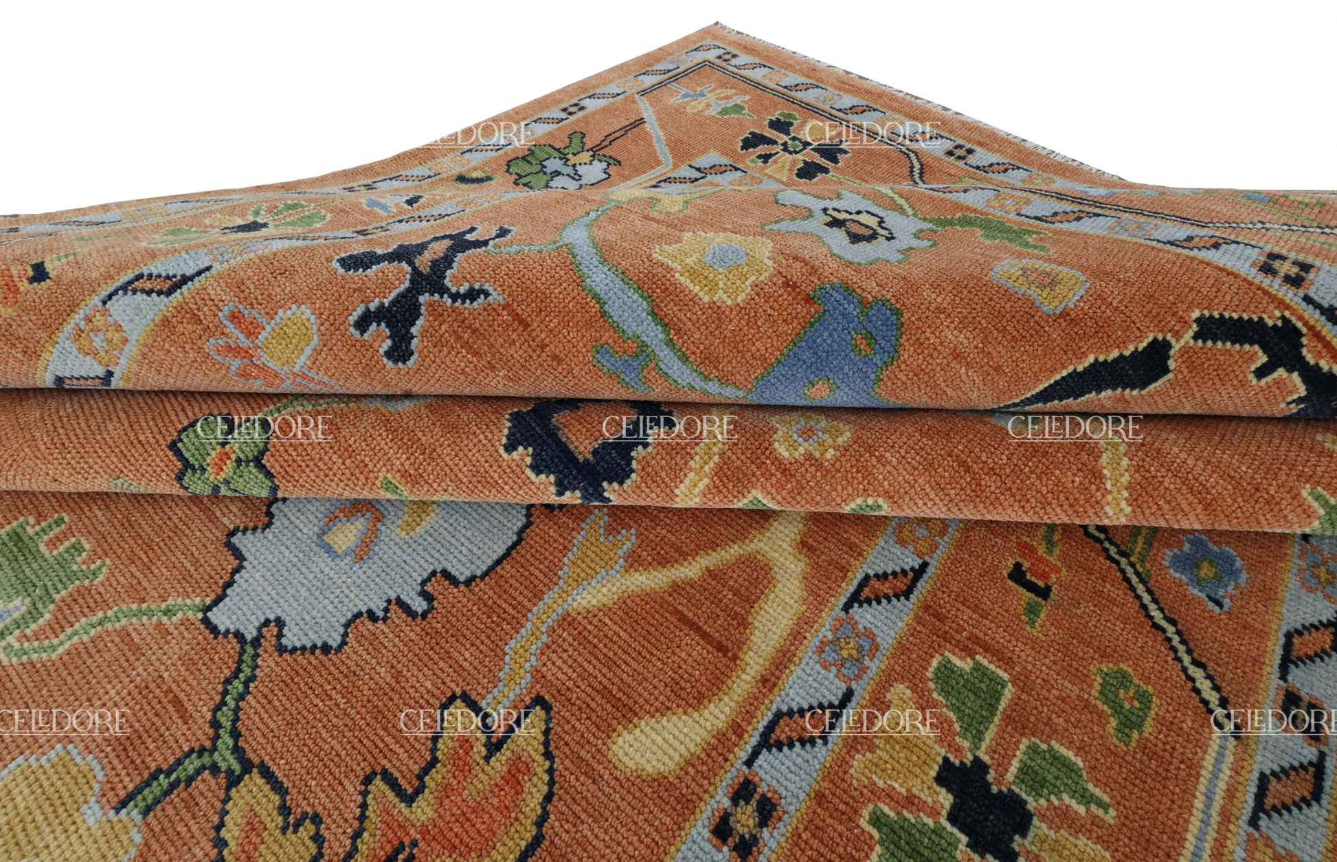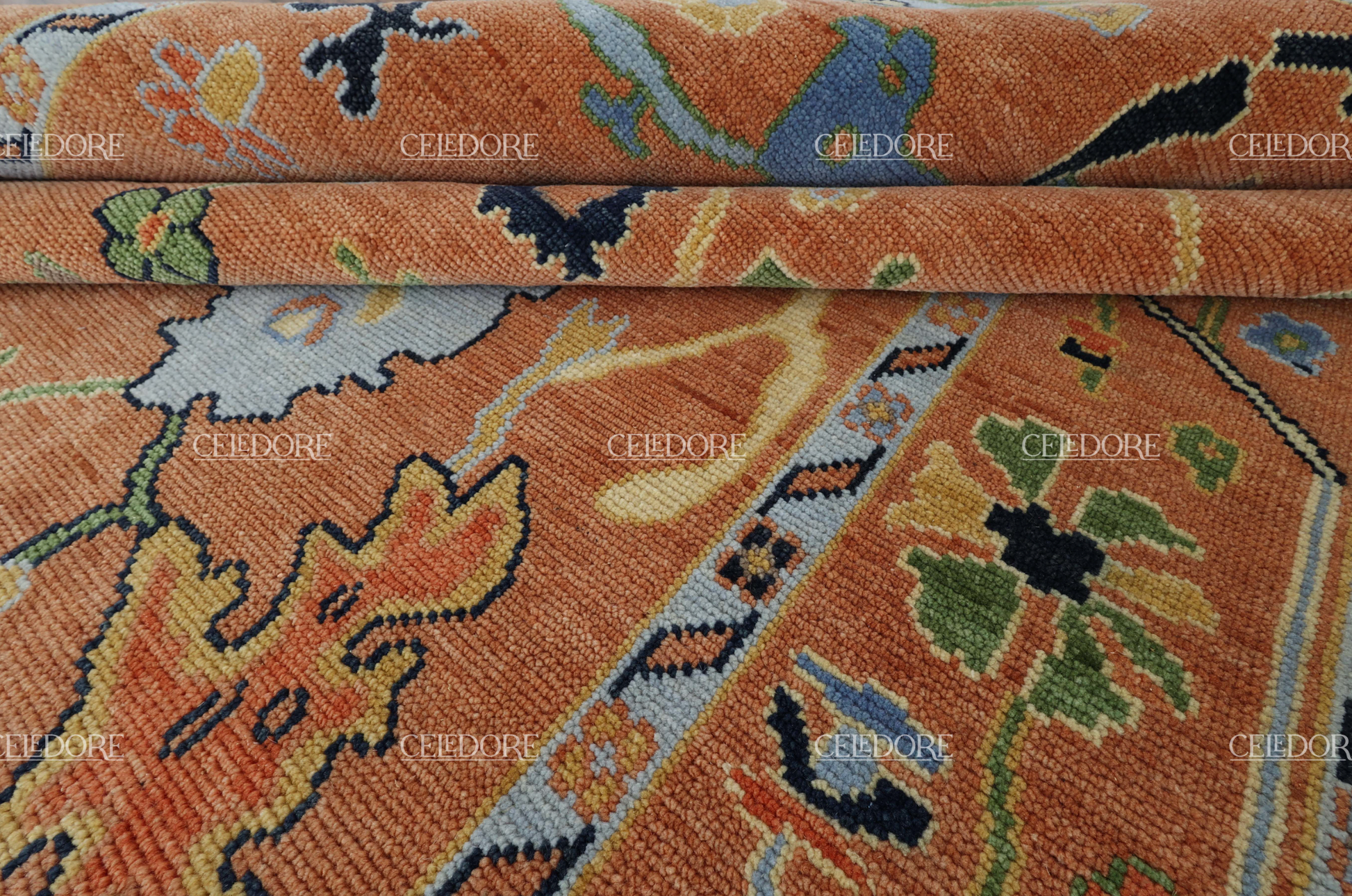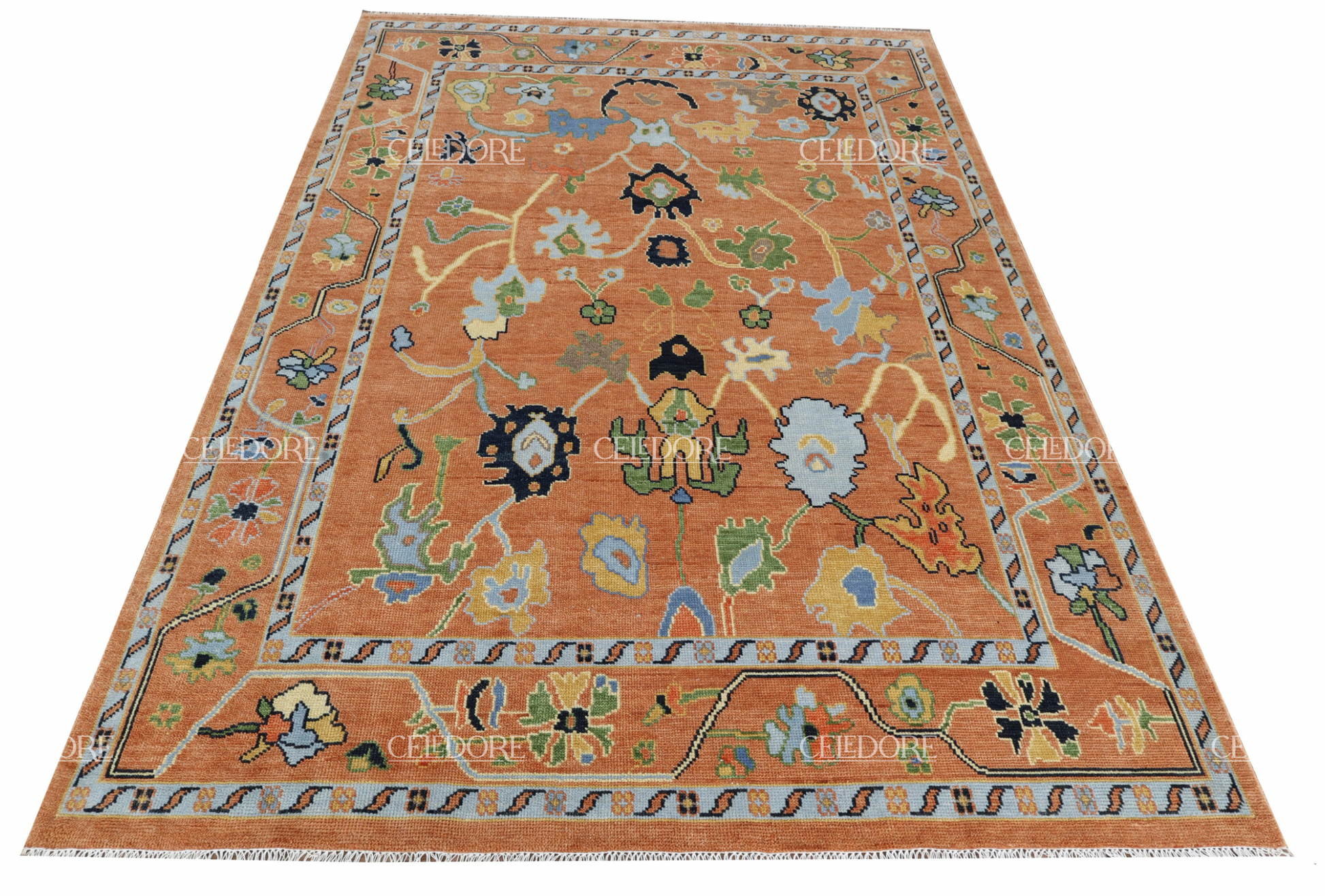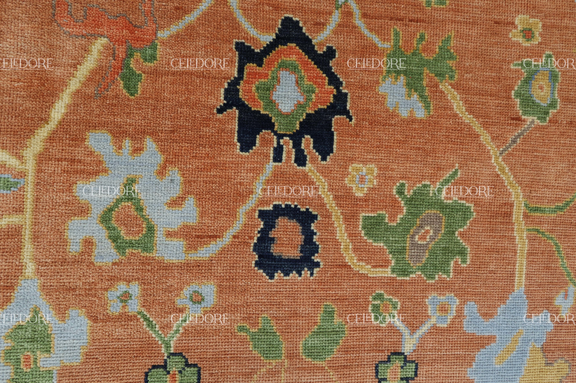 Hand-Knotted Oushak Rug, meticulously crafted with the finest quality wool. This rug embodies the rich tapestry of Indian craftsmanship, blending traditional design with a contemporary twist, reminiscent of the vibrant villages of India.